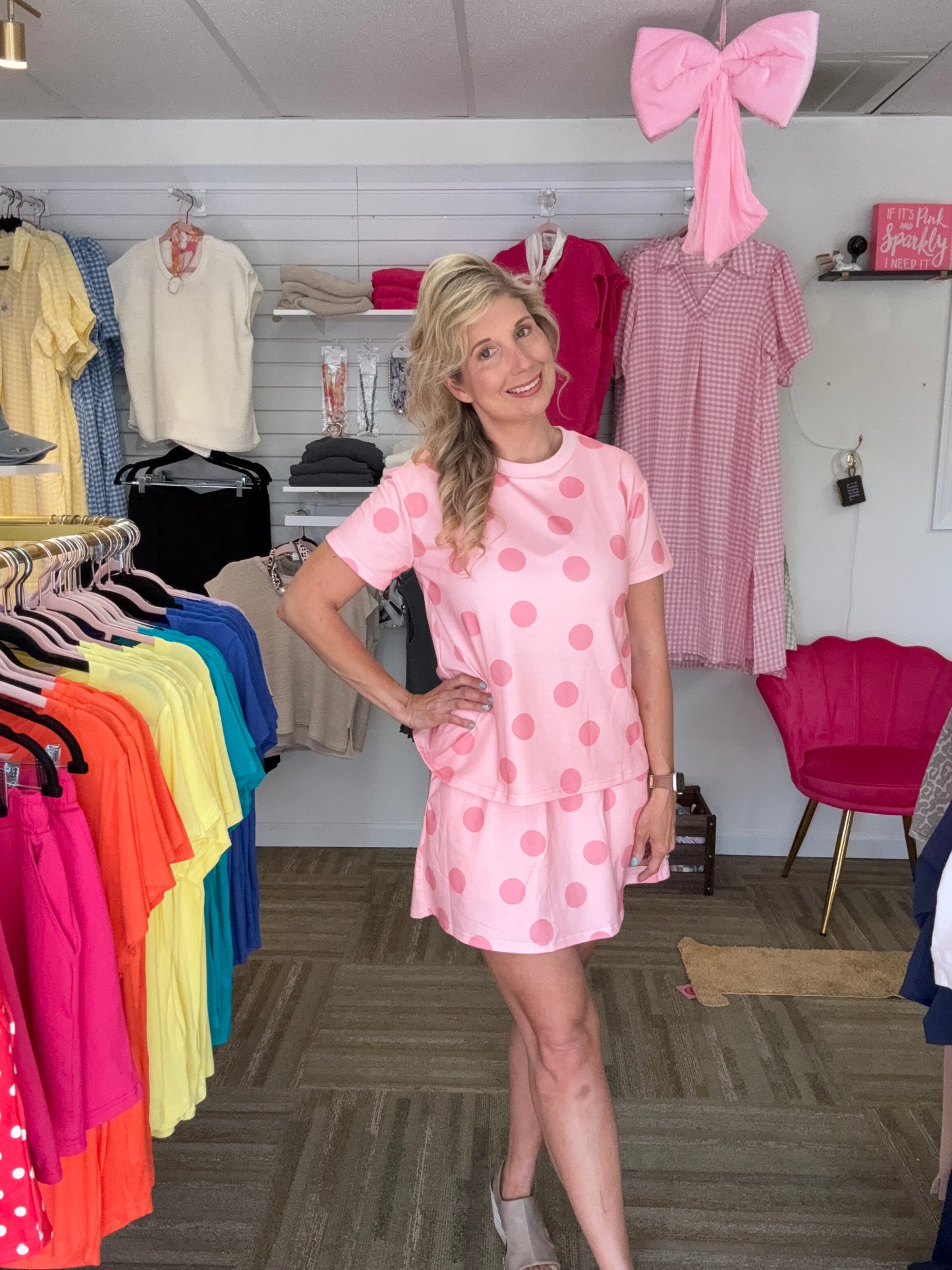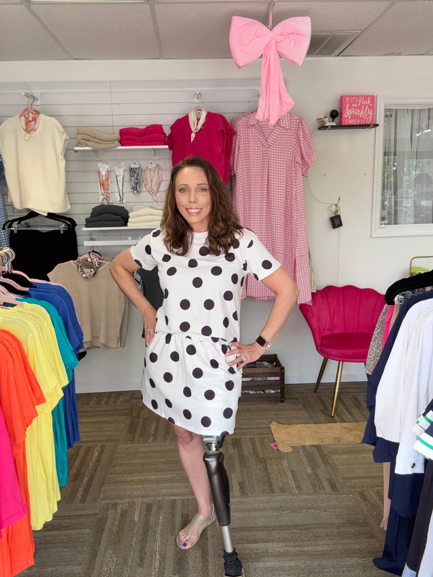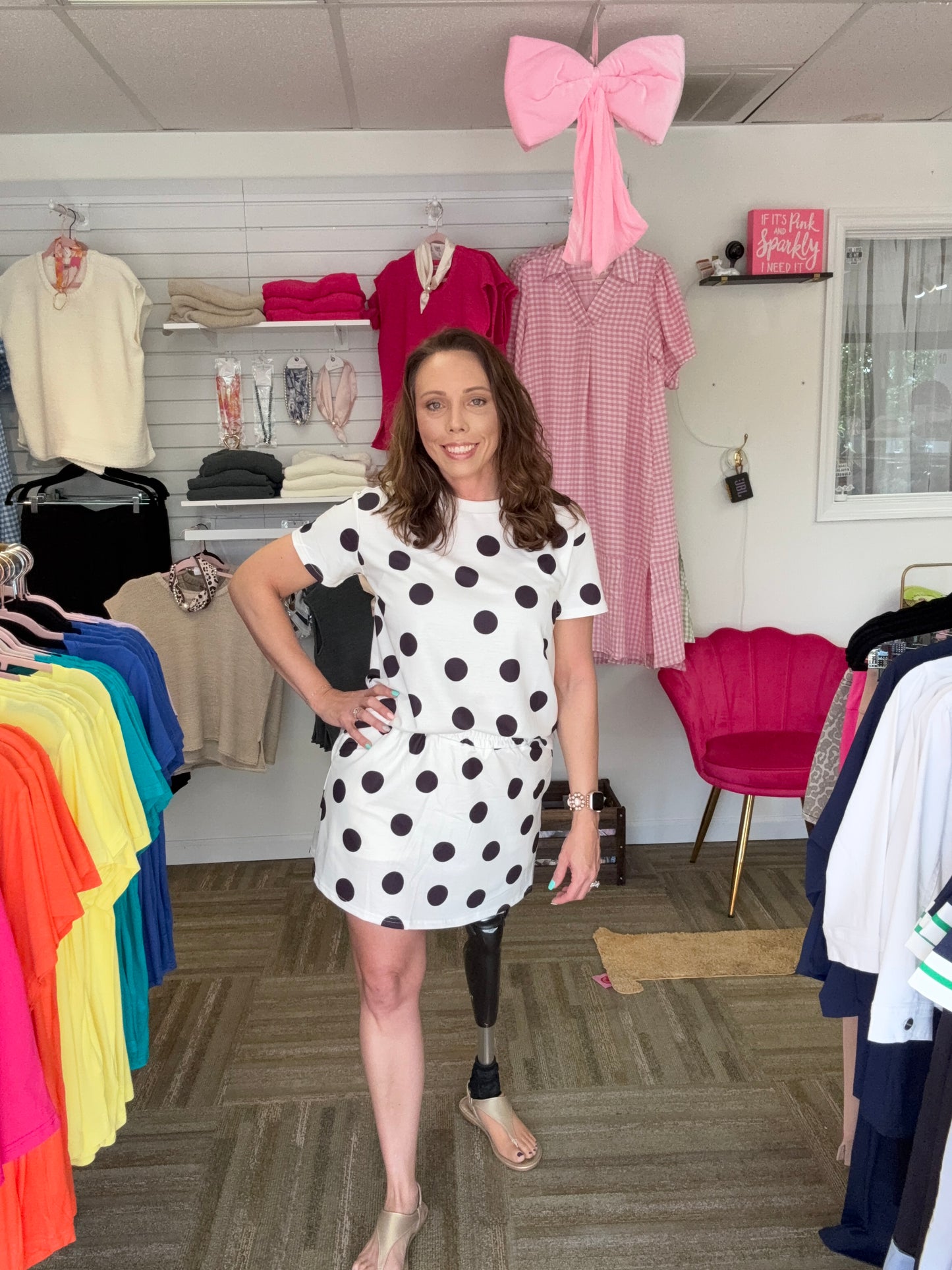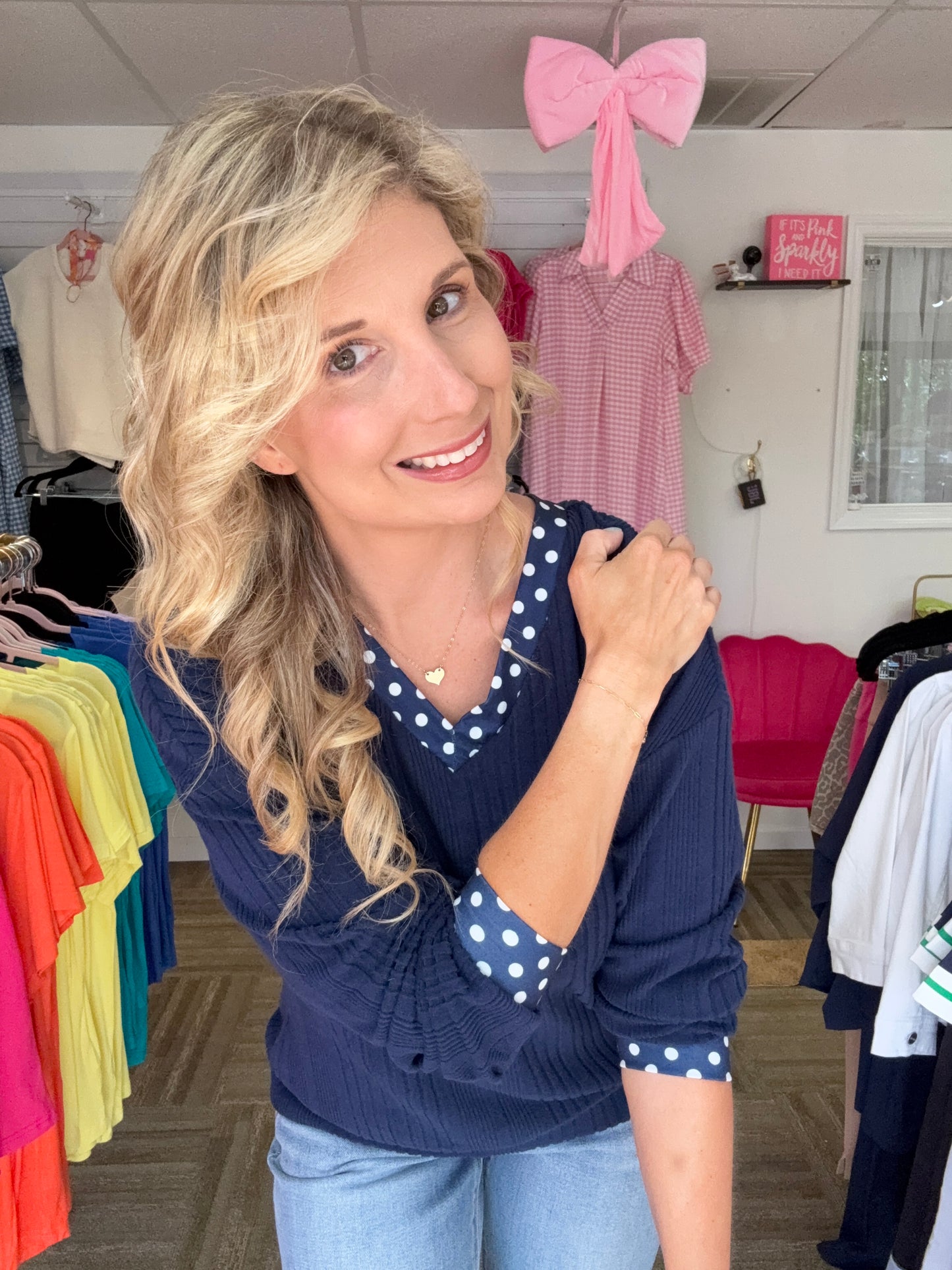 Navy Polka Dot Ribbed V-Neck Top with Back Bow Detail