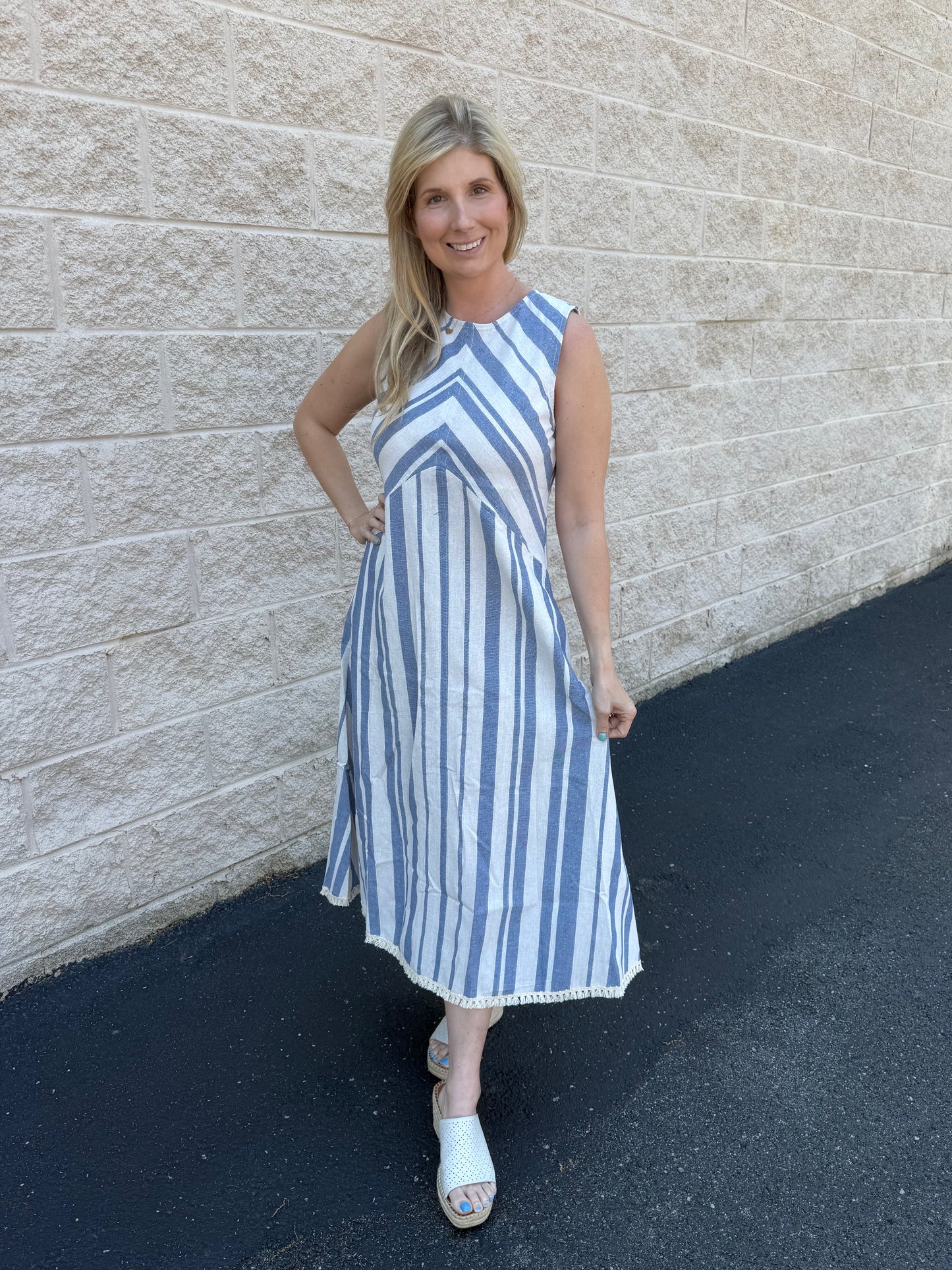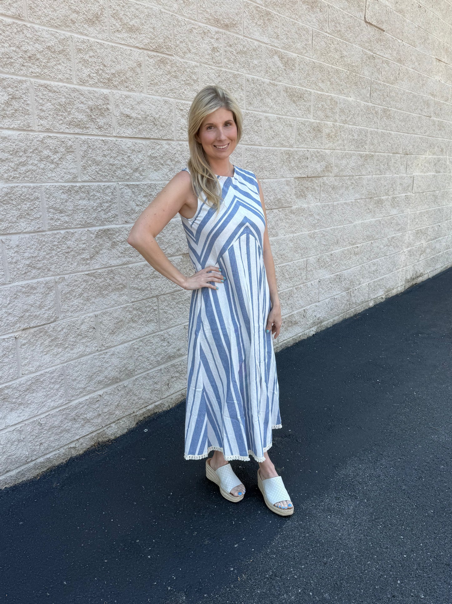 Coastal Striped Linen-Blend Sleeveless Midi Dress