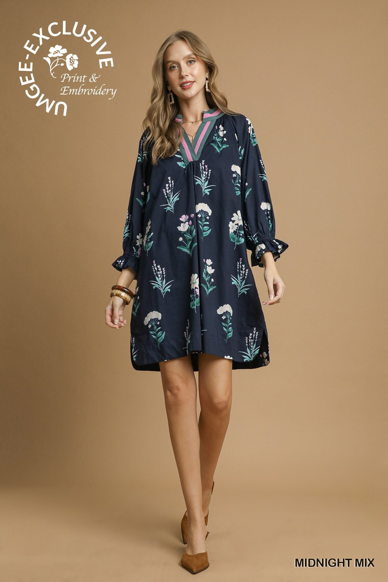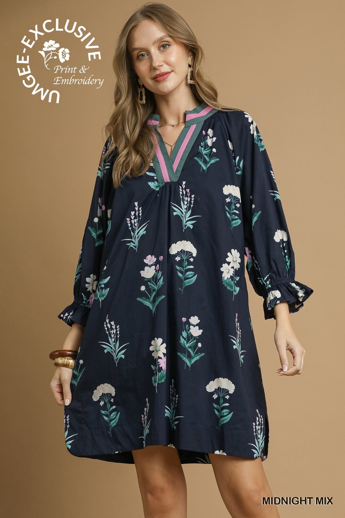 Elevate your everyday style with this stunning Umgee Exclusive print tunic dress, designed in the captivating Midnight Mix floral pattern. Featuring a bold contrast V-neckline in vibrant pink and green, this dress blends playful charm with timeless elegance. The relaxed A-line silhouette offers effortless comfort, while the 3/4 sleeves with gathered cuffs add a polished finish.