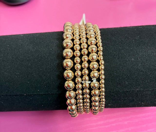 A timeless stack of gold beaded stretch bracelets featuring a mix of bead sizes for subtle texture and shine. Effortless and versatile, this set transitions beautifully from day to night. Each bracelet can be worn alone for a minimalist touch, or layered together for a bold, polished look.