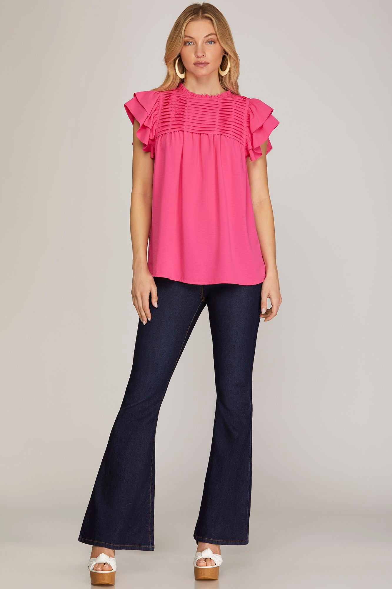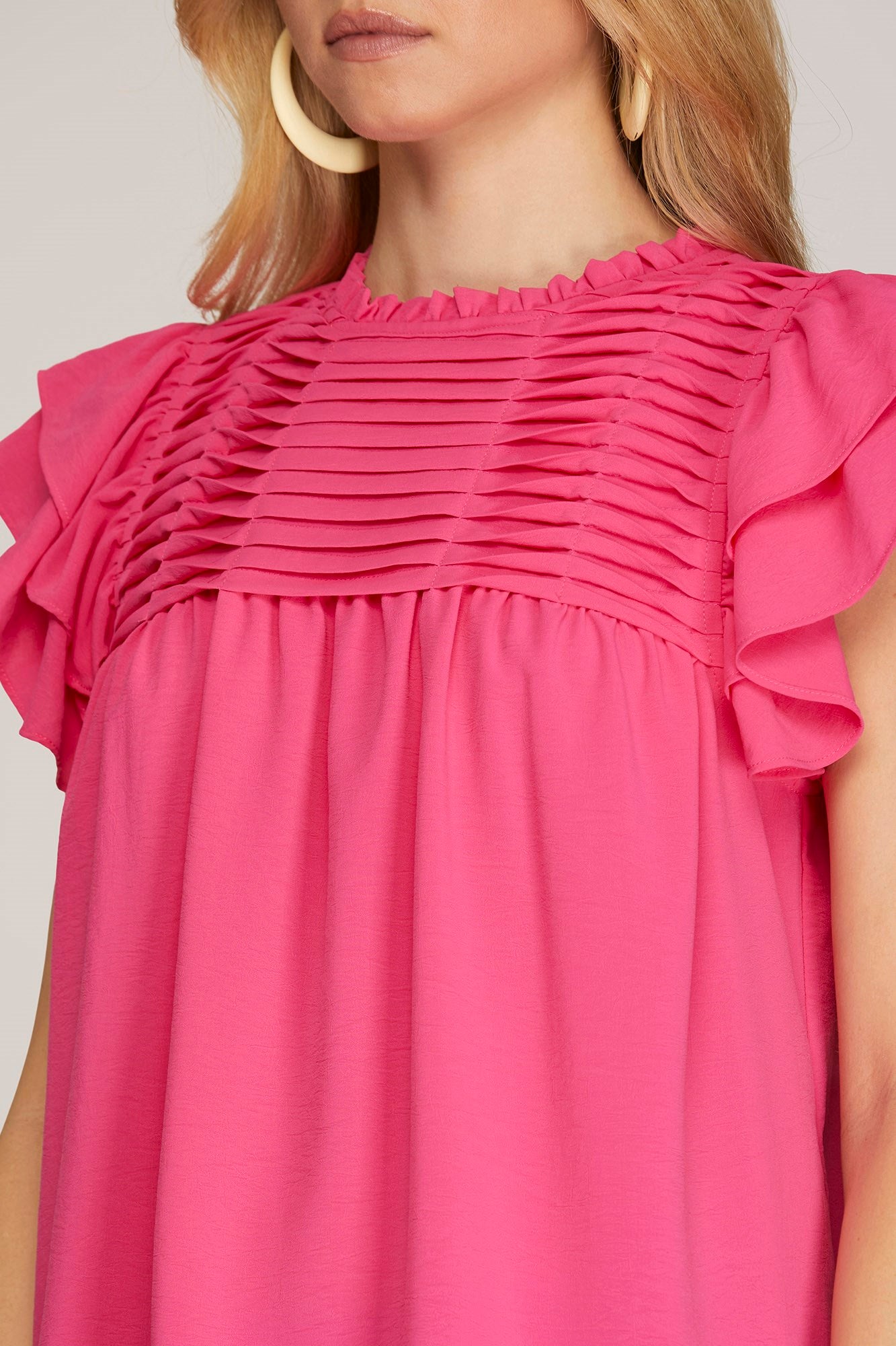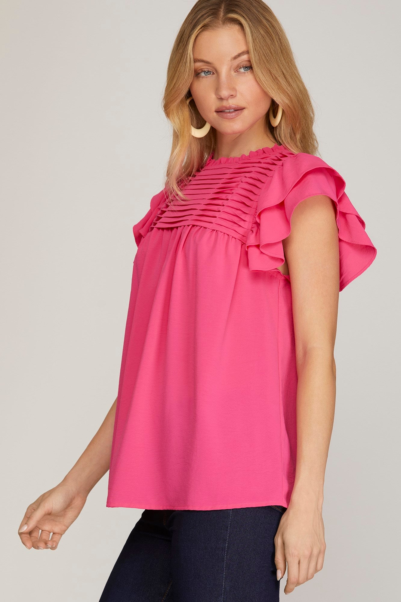 Hot Pink Ruffle Sleeve Pleated Woven Top – Sizes Small to Large