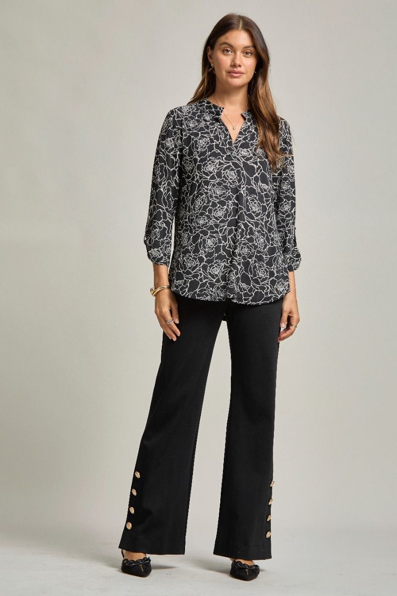 Our signature Lizzy Top is back in a sleek black floral outline print—perfect for workdays, weekends, and everything in between. Crafted from our luxurious poly-spandex blend, this top is lightweight, wrinkle-free, and cooler than linen, making it a dream for travel and all-day wear.