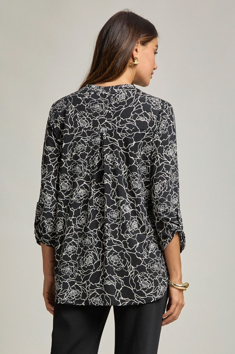 The Lizzy features a flattering mandarin collar neckline, 3/4-length sleeves with tab details, and a relaxed, flowy fit. The subtle high-low hemline adds movement and coverage, giving you an effortlessly chic look for any occasion.