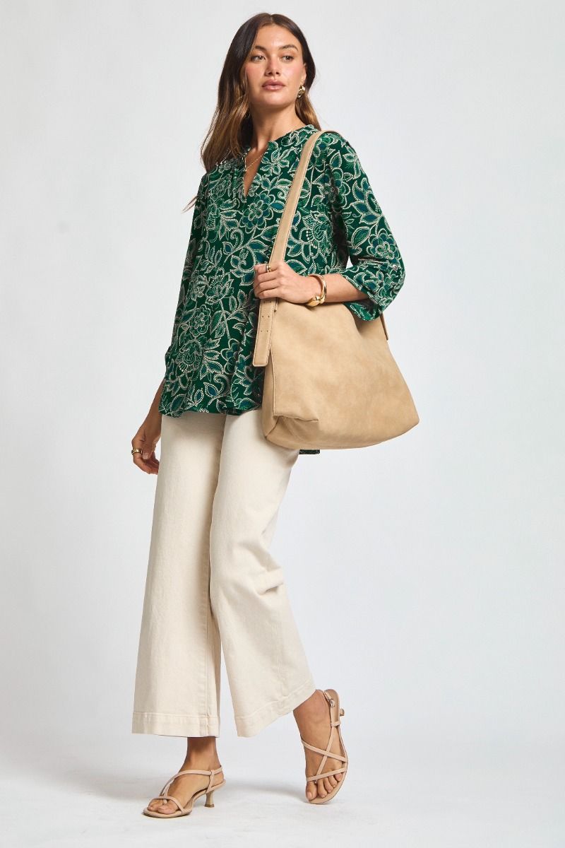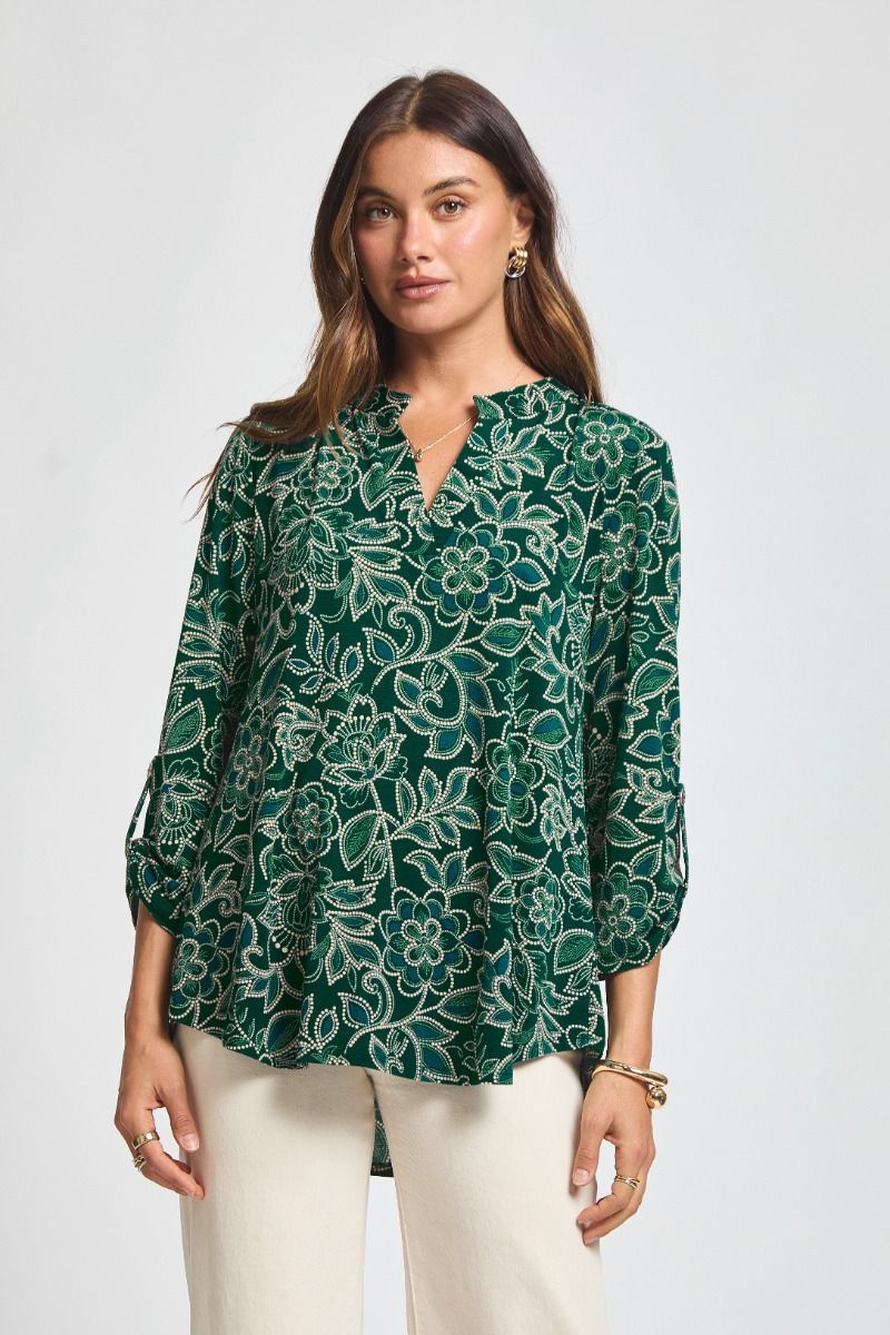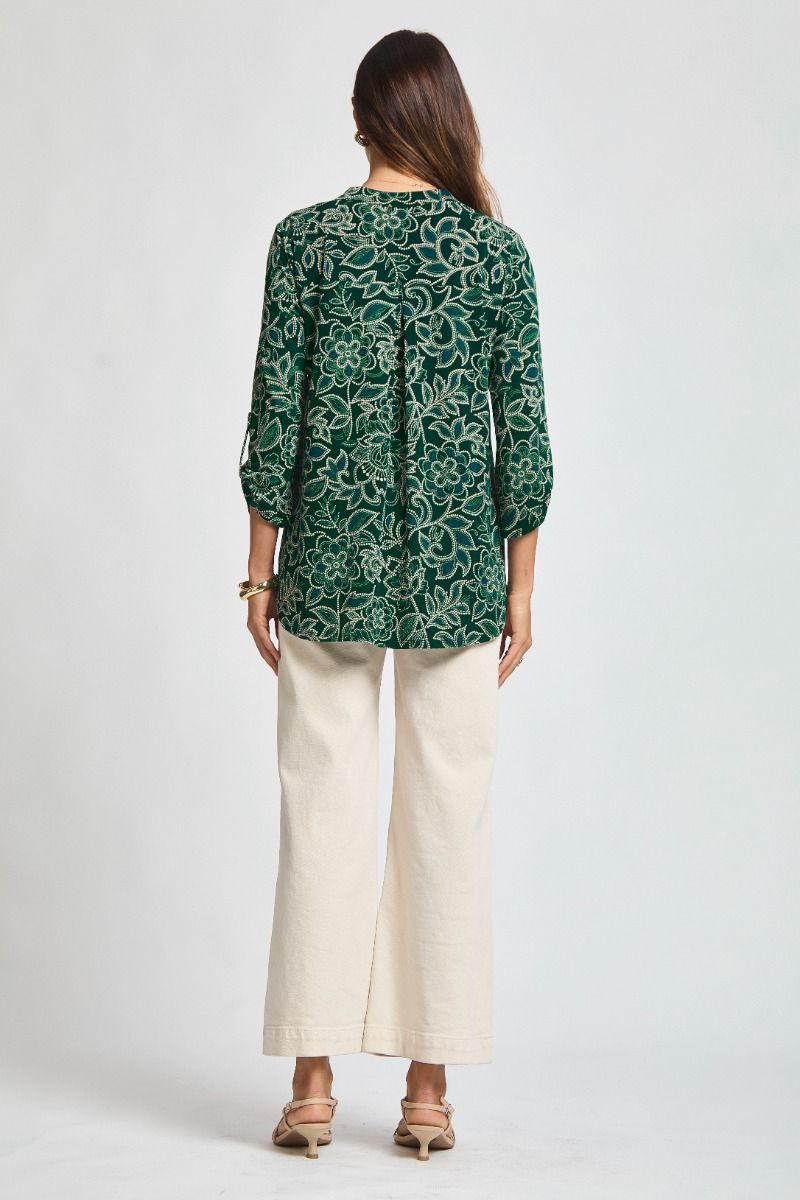 The deep hunter green background is adorned with delicate white floral outlines, creating a timeless pattern that’s easy to style for work or weekend. The mandarin collar neckline, 3/4 length tab sleeves, and relaxed high-low silhouette make this a flattering, fuss-free choice you’ll reach for again and again.