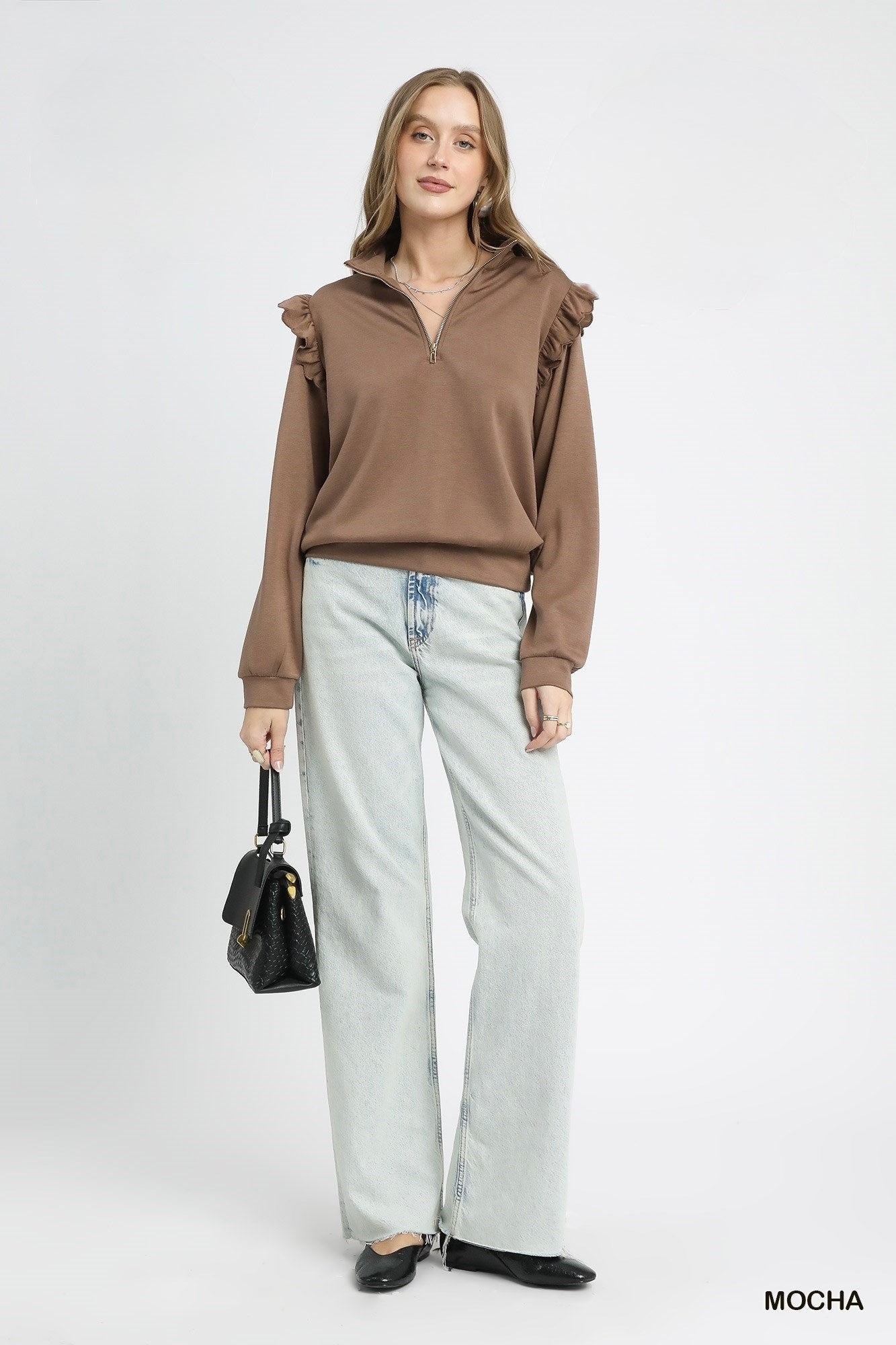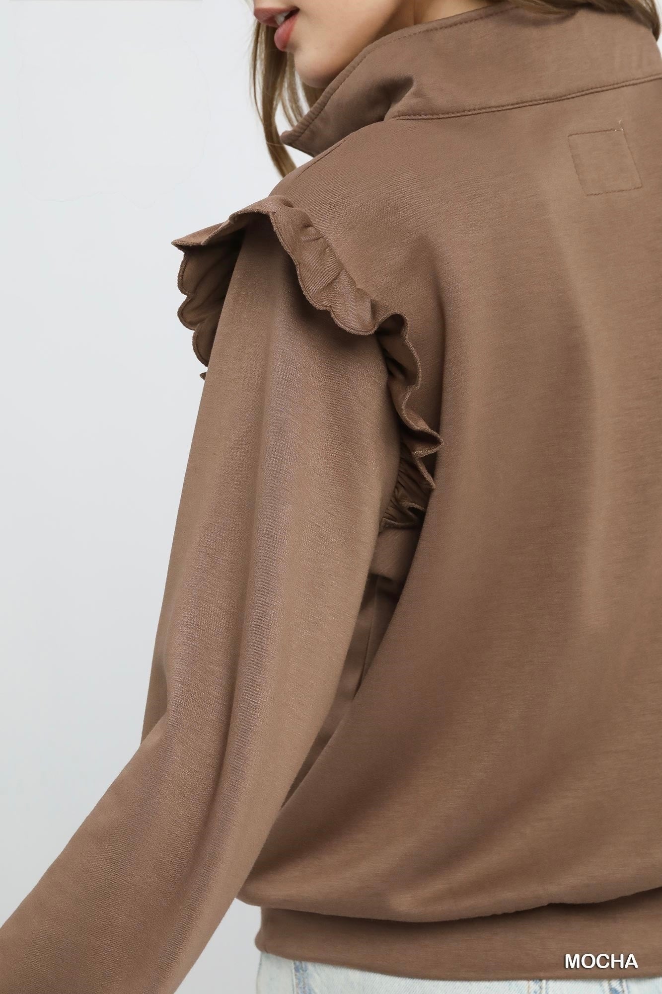Luxeknit Ruffle Shoulder Quarter-Zip Pullover – Mocha