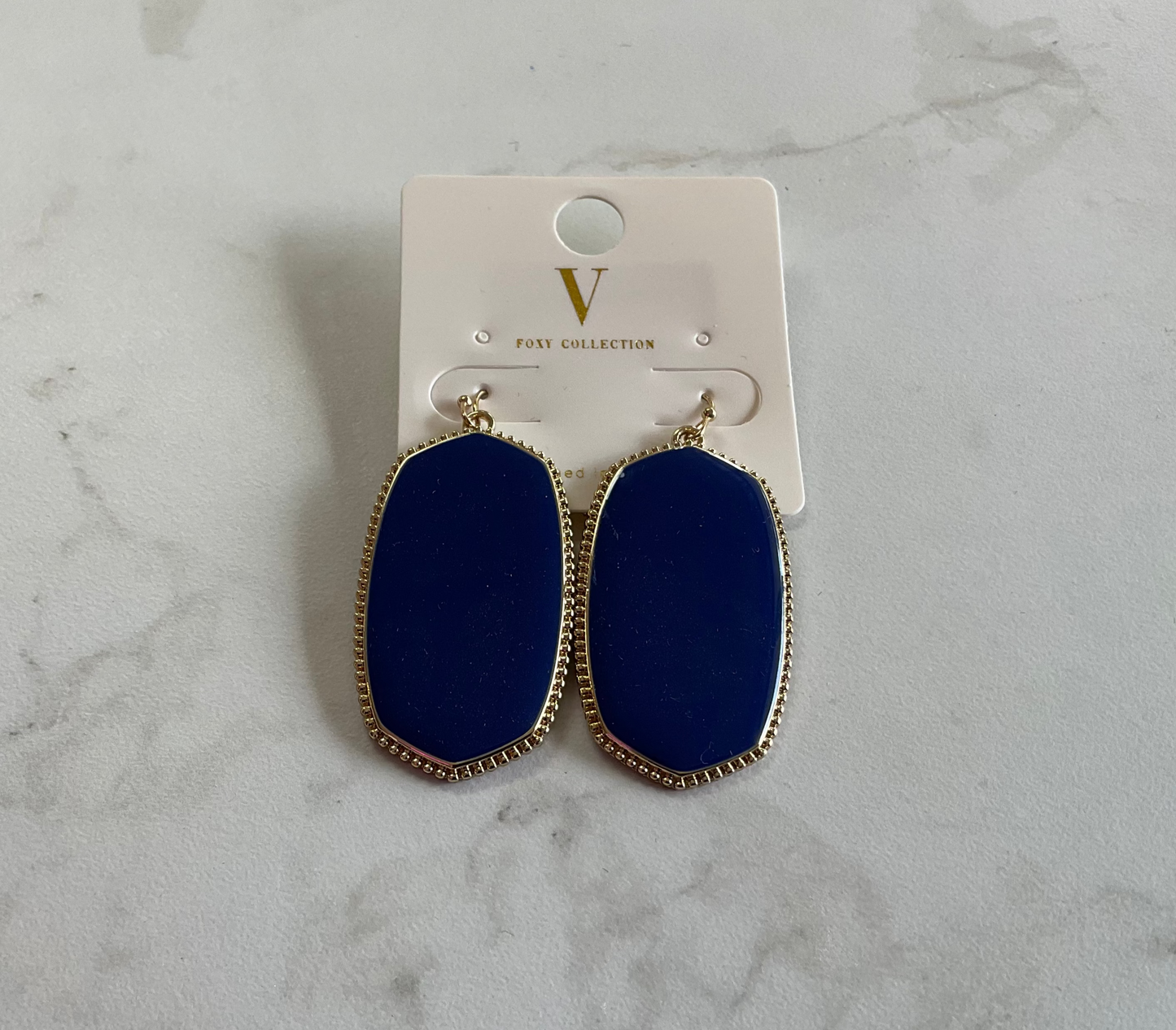 Make a bold yet timeless statement with these stunning navy drop earrings. Featuring a sleek geometric shape framed in a delicate gold-tone border, these earrings strike the perfect balance between modern edge and classic elegance.