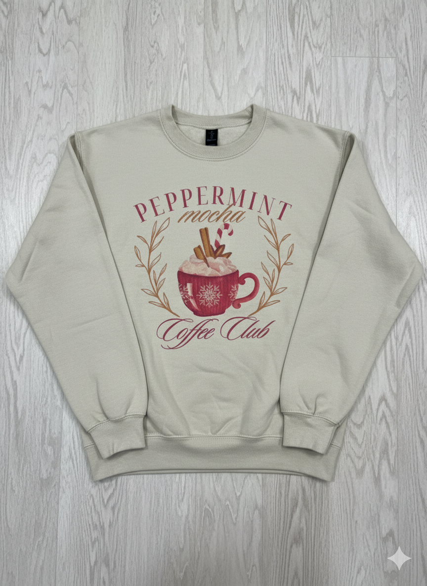 Embrace the charm of winter mornings and café vibes with our Peppermint Mocha Social Club Sweatshirt. Featuring a festive red mug wrapped in gold laurel accents, this design brings a dash of preppy holiday cheer to your cozy wardrobe.