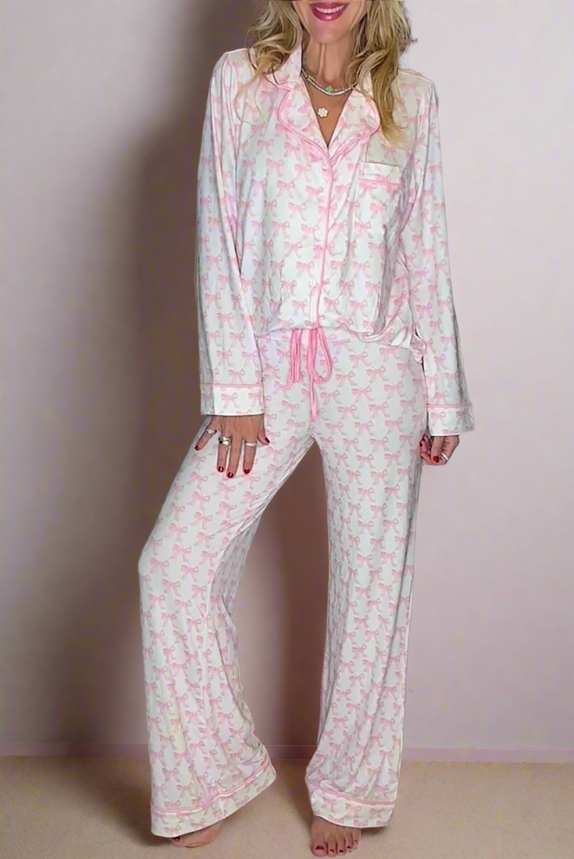 Pink Bow Print Long Sleeve Shirt and Pants Soft Pajama Set