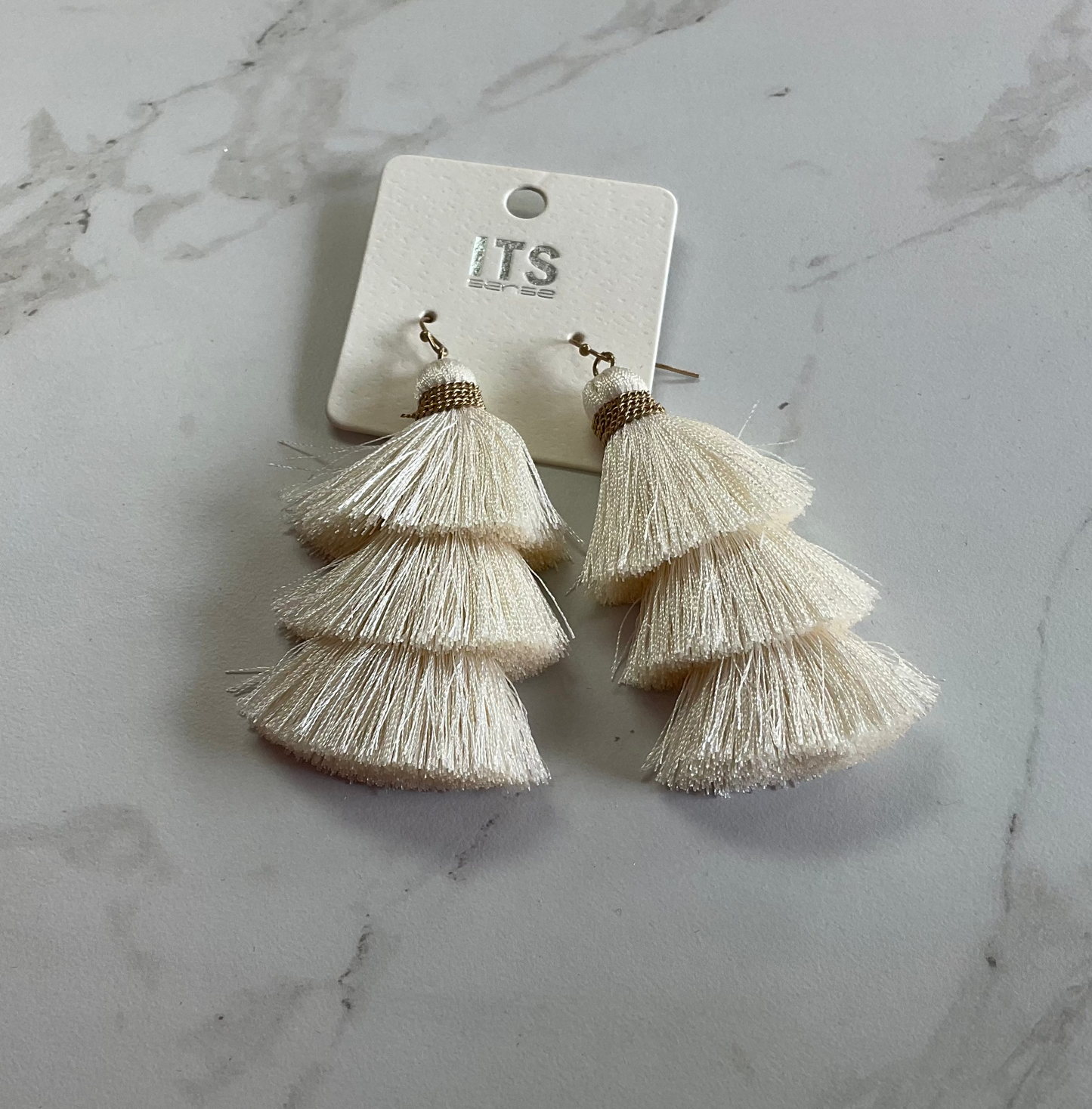 Turn heads with these statement tassel earrings — the perfect mix of playful movement and chic sophistication. Featuring three layers of soft cream-colored fringe, the tiered design creates gorgeous flow and dimension, catching the light with every step.