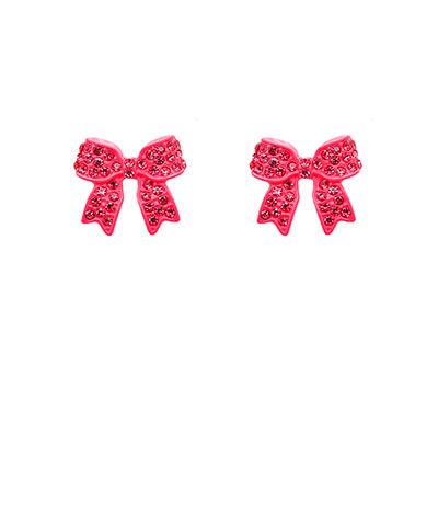 Crystal bow stud earrings in red, light pink, and hot pink displayed on a white background from The Pink Doxie Boutique.