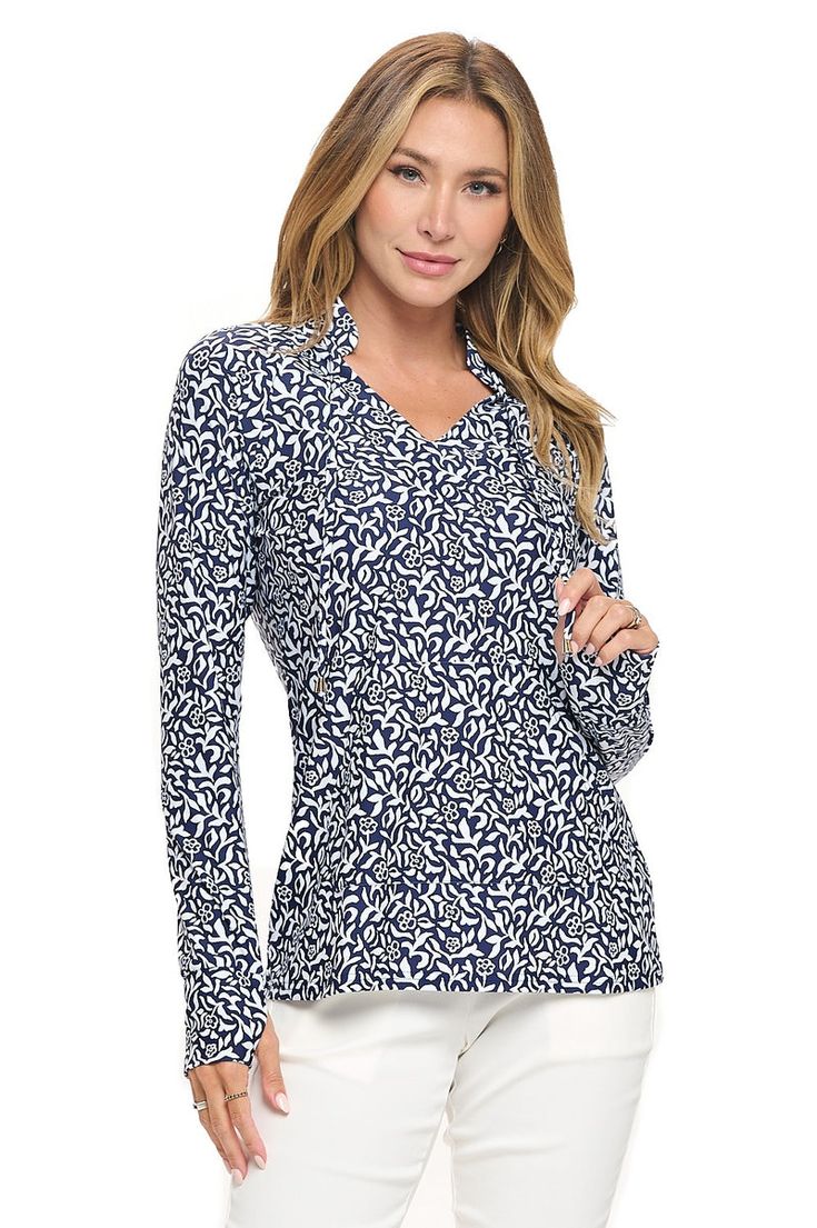 Say hello to elevated everyday wear—The Scarlett Thumbhole Polo Top in Navy is your new wardrobe MVP. With its preppy floral print, buttery-soft cotton blend, and sassy thumbhole sleeves, this top blends comfort and charm in all the right ways.
