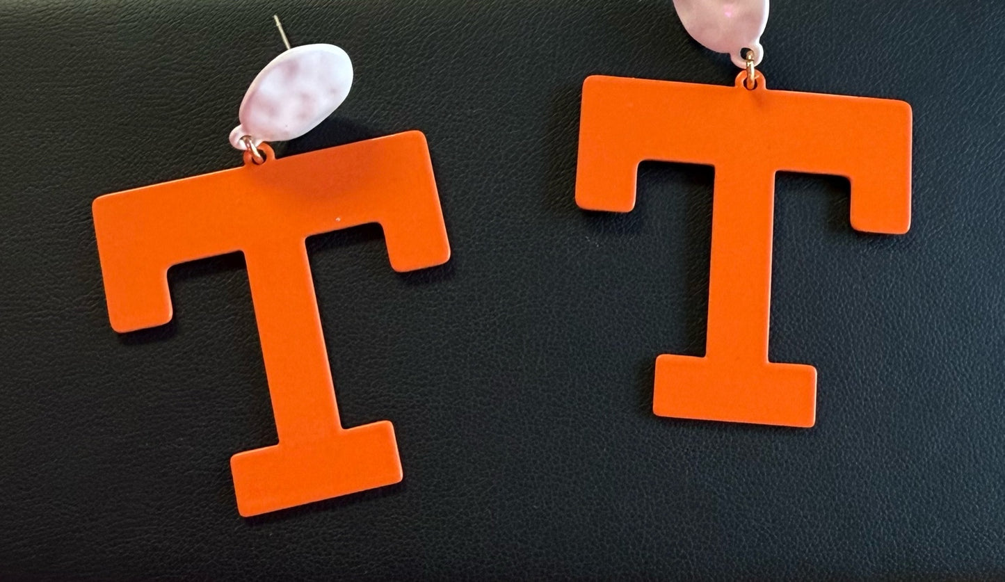 - 🔶 Classic Block T Drops – Bold orange “T” earrings that show your pride loud and clear.