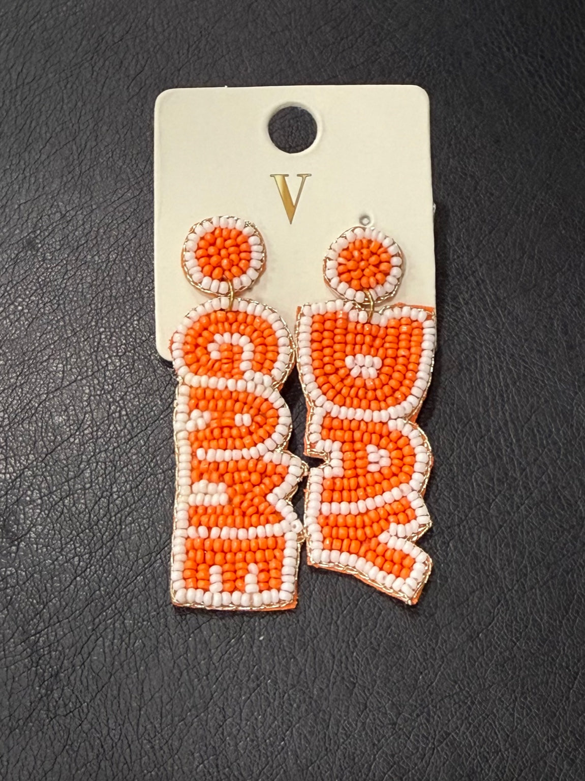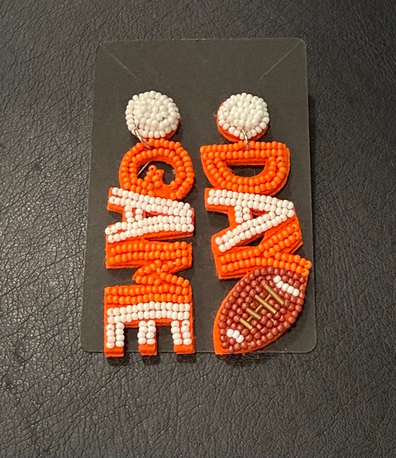- 🏈 Beaded “Game Day” Words – Classic orange & white beaded statement earrings.