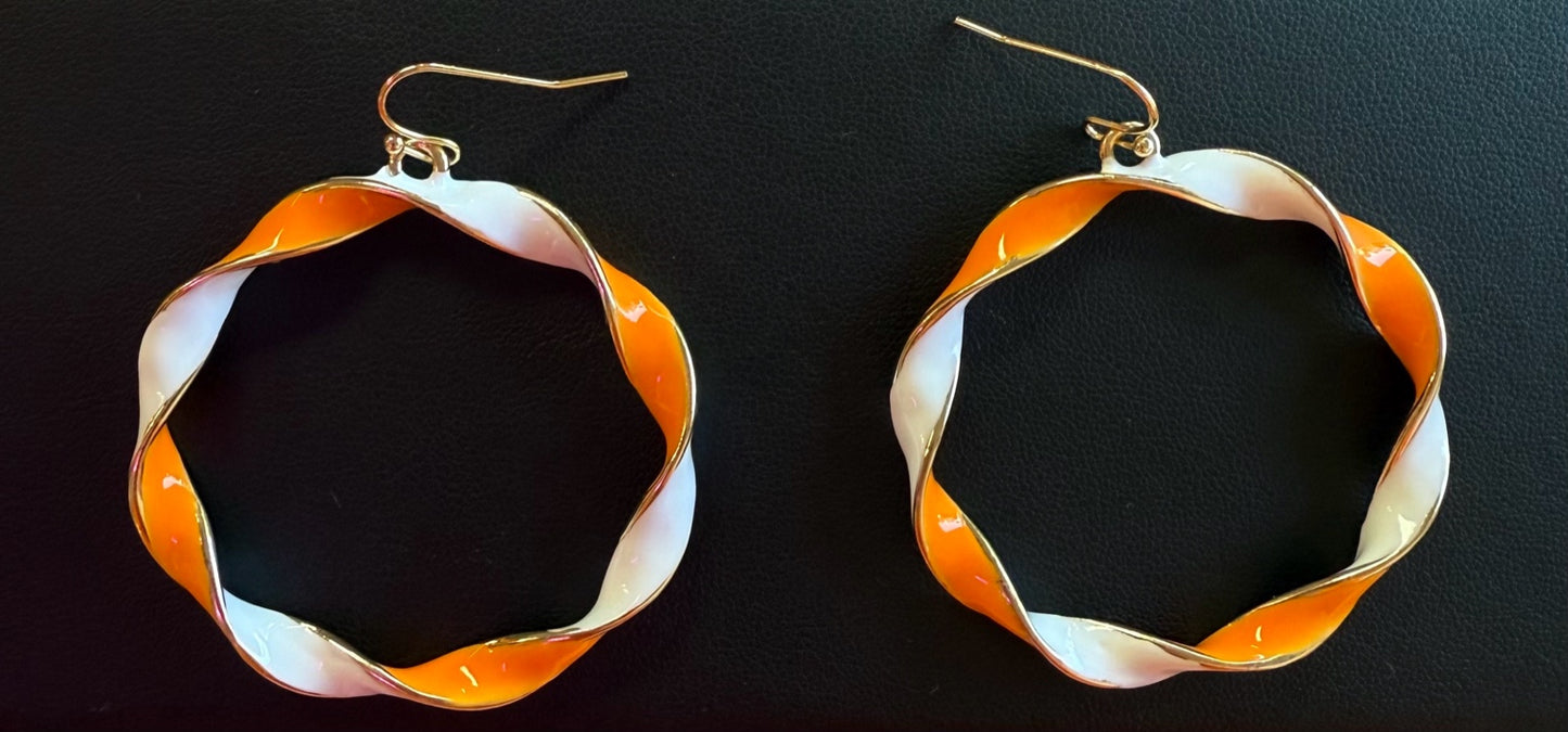 - 🔄 Twisted Orange & White Hoops – Sleek hoops with a bold twist, perfect for pairing with any look.