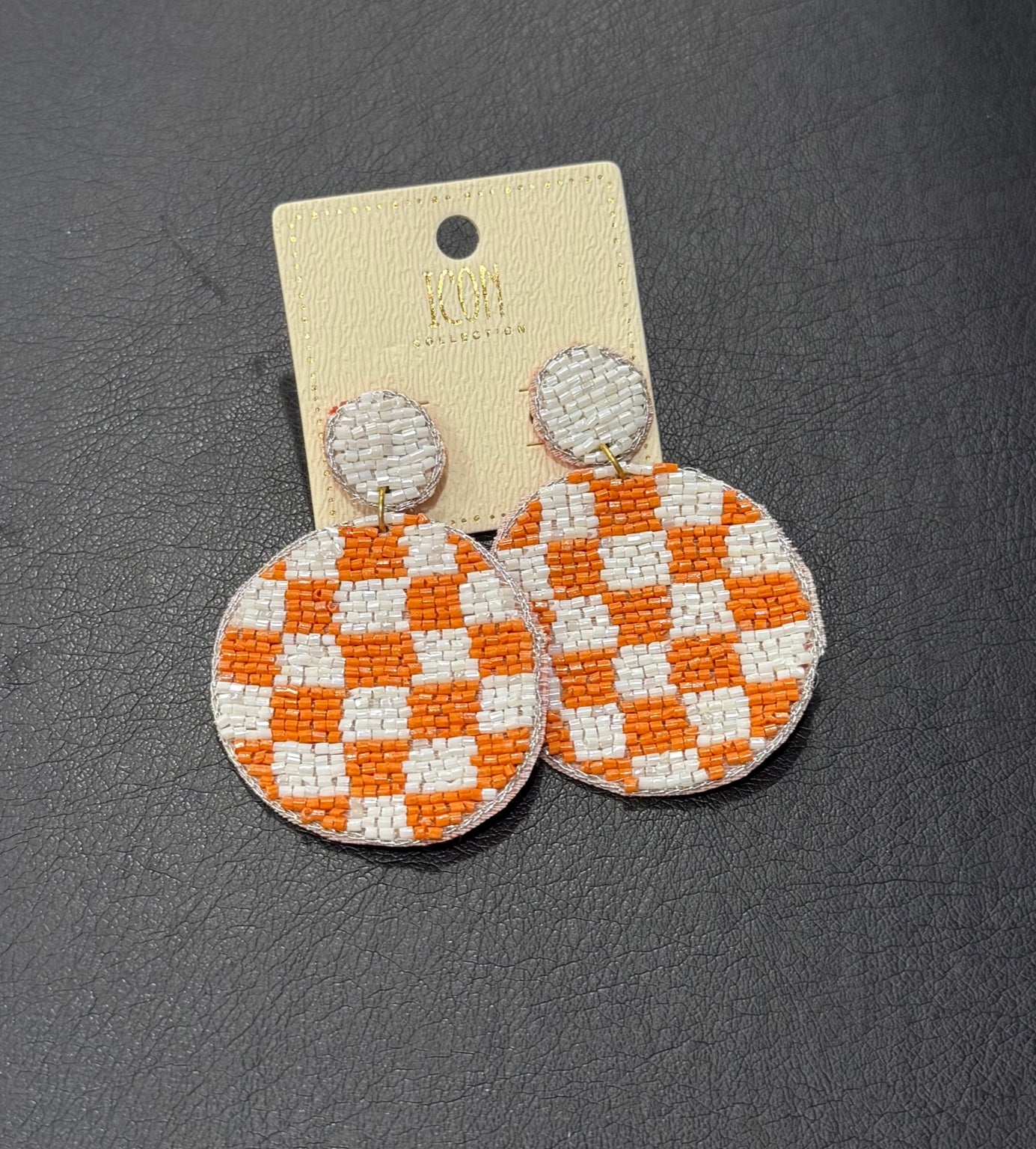 - 🧡 Checkerboard Beaded Circles – Iconic orange-and-white check for a true Tennessee classic.