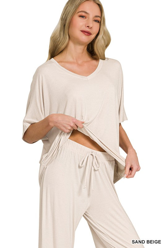 Elevate your off-duty look with the perfect blend of luxury and comfort. Crafted from a buttery-soft Rayon-Spandex blend, this oversized loungewear set features a flattering V-neck top and relaxed-fit pants designed for effortless movement. Whether you're navigating a long flight, working from home, or enjoying a slow Sunday morning, this versatile 2-piece set ensures you look chic without sacrificing an ounce of comfort.