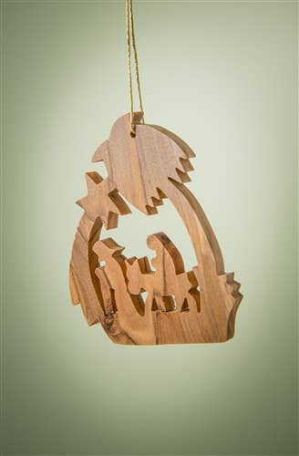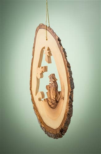 Olive Wood Bark Slice Nativity Ornament – Handcrafted in Bethlehem (4–6”)