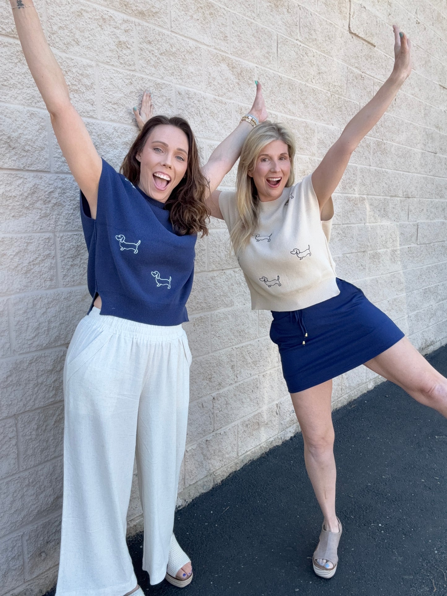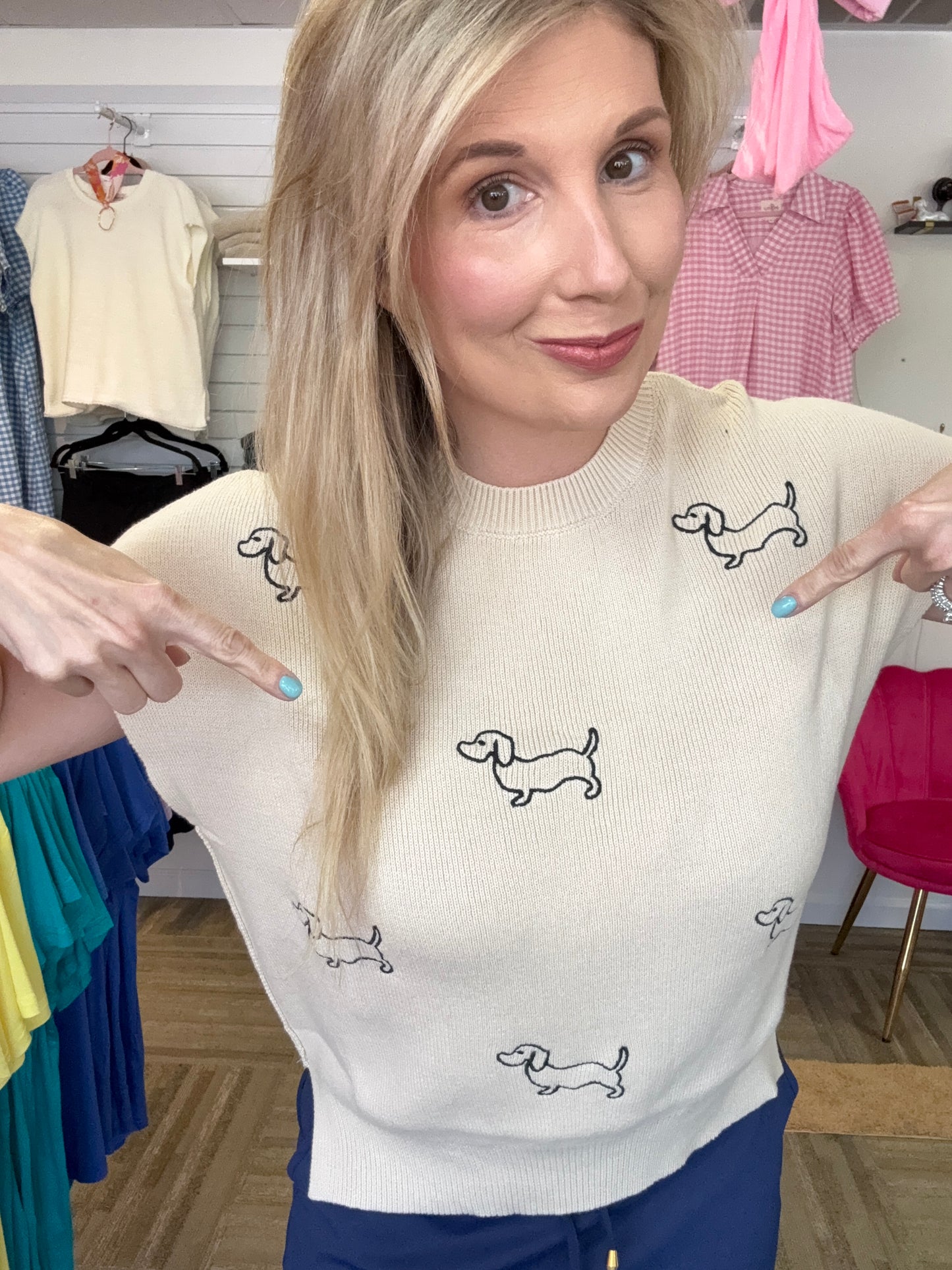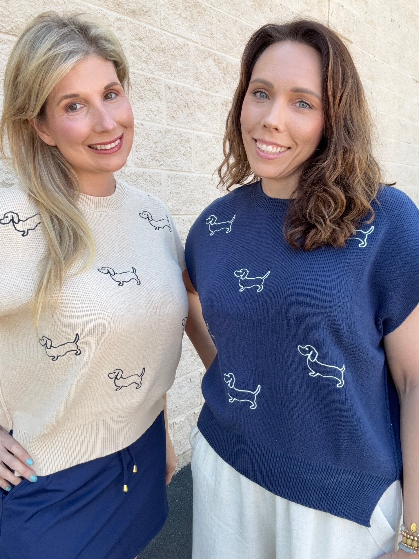 Elevate your everyday style with this charming dachshund-embroidered sleeveless sweater crafted from a premium breathable cotton blend. This chic knit top merges whimsical dog-lover flair with a sophisticated silhouette, perfect for effortless layering or wearing solo.