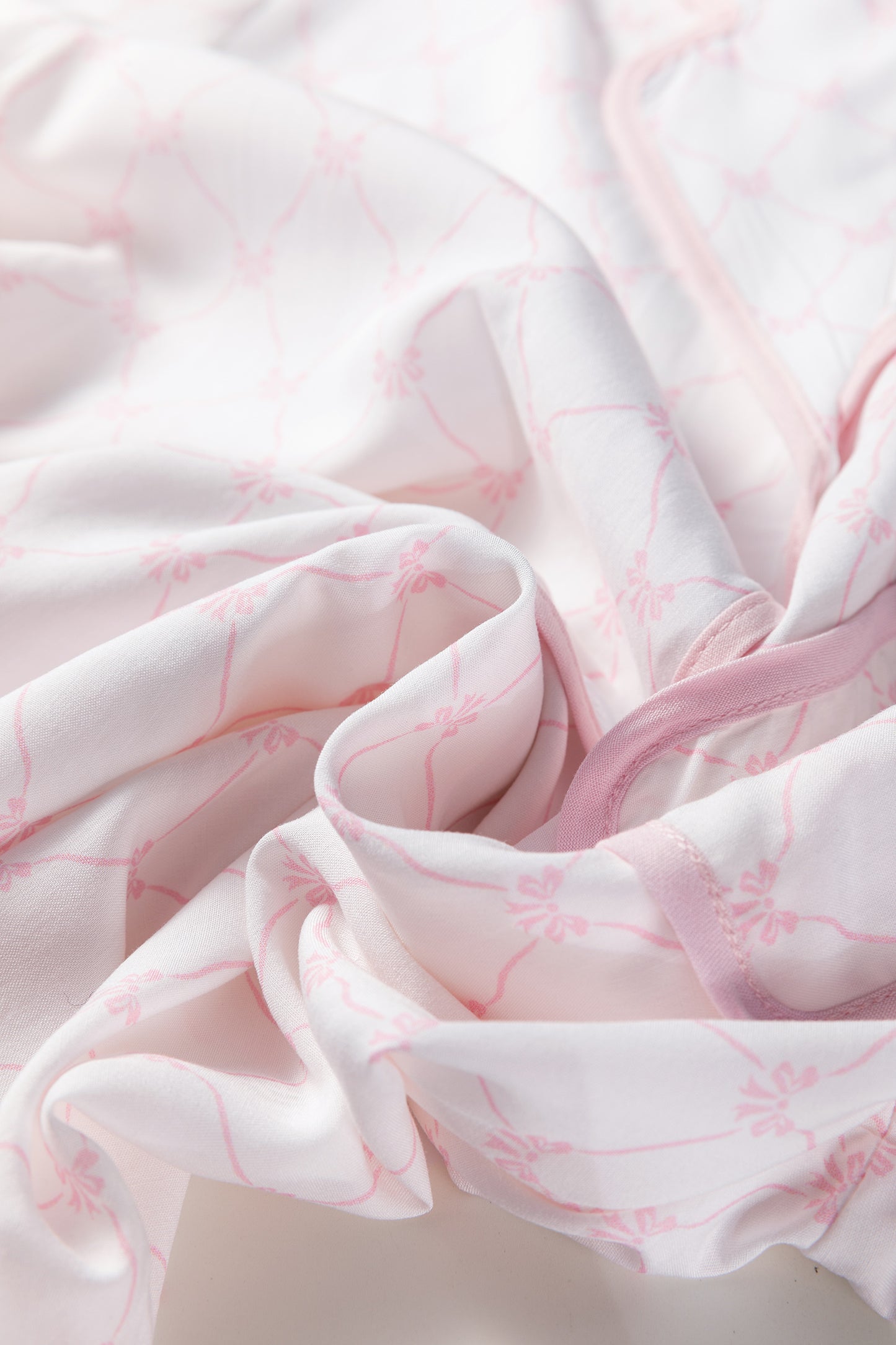 Crafted from 100% breathable viscose, this pajama set feels silky-soft against the skin while keeping you cool and comfortable all night long. The delicate bow lattice print adds a romantic, girly touch, while the ruffled sleeve cuffs and adjustable bow ties elevate the look with just the right amount of charm.