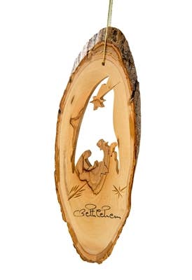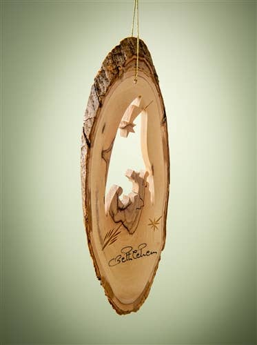 Crafted in the heart of Bethlehem by the Giacaman Family, this stunning Bark Slice Nativity Ornament brings the Christmas story to life in a rustic and heartfelt way. Featuring the Holy Family beneath the guiding star, with the shepherd’s crook as a reminder of God’s faithful provision, this piece beautifully captures the humble wonder of Christ’s birth.