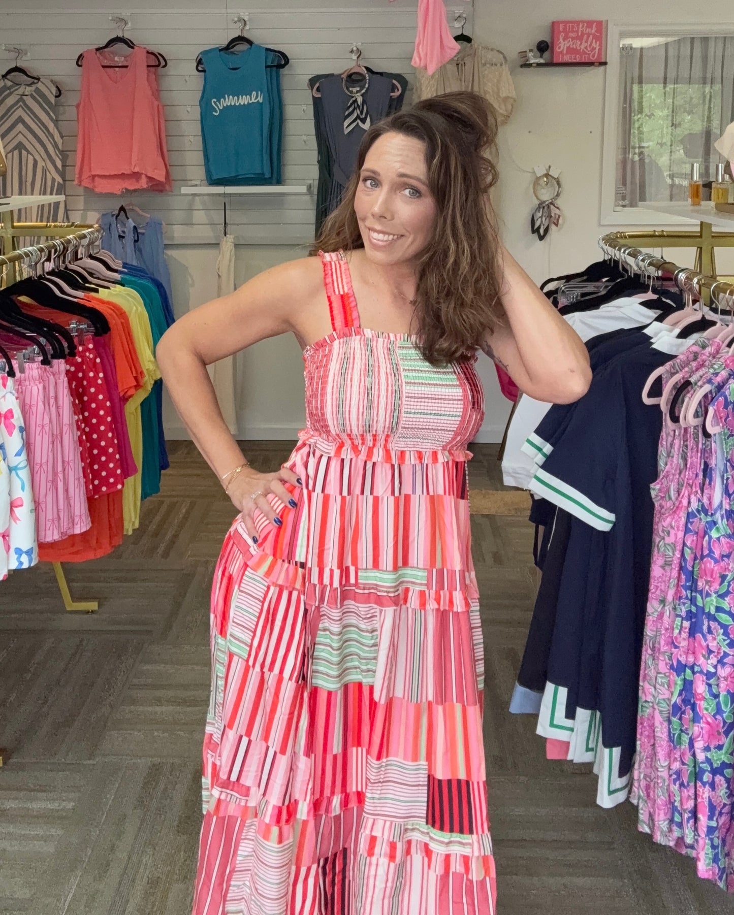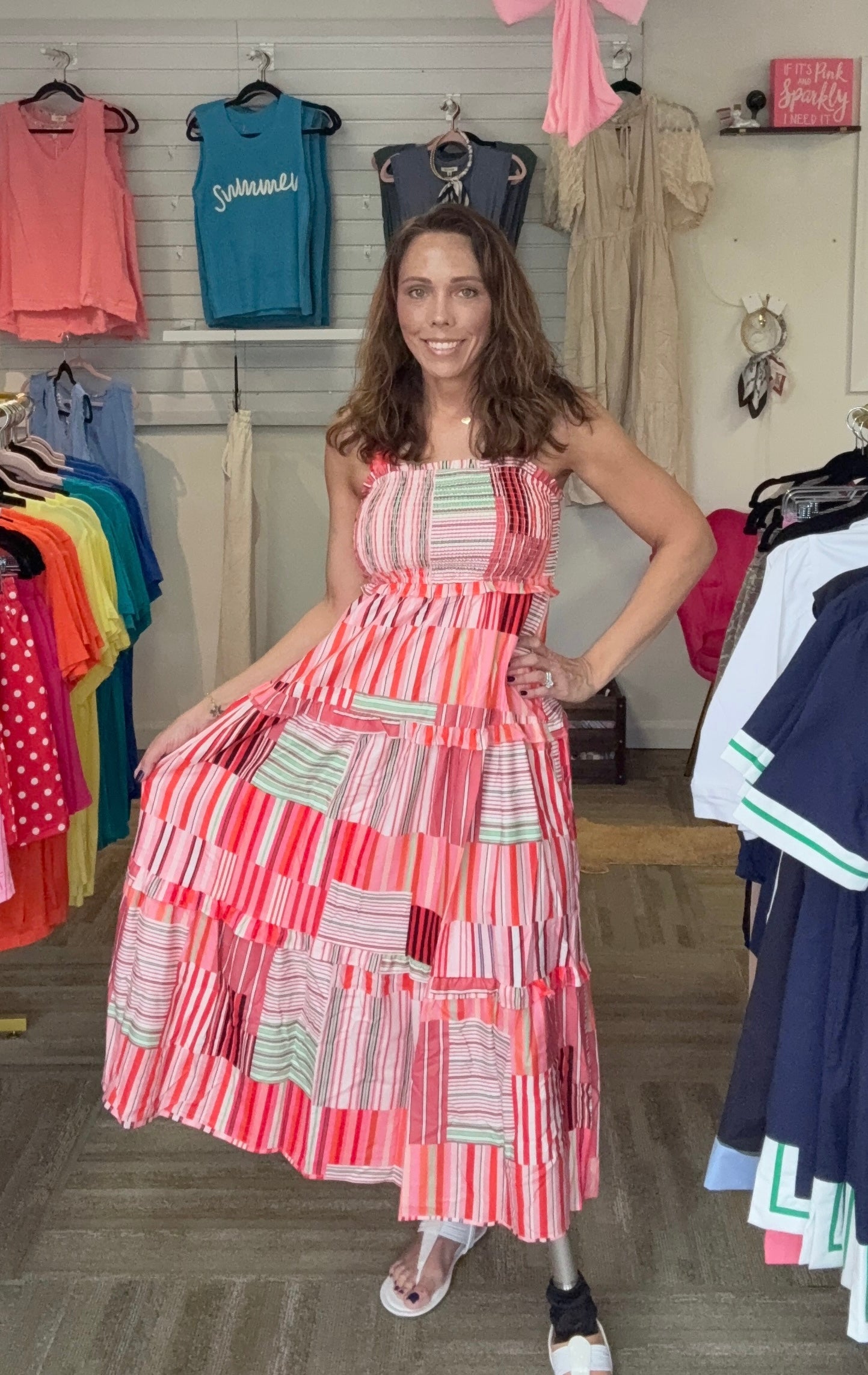 Radiate summer confidence in this vibrant, patchwork-striped maxi designed with a figure-flattering smocked bodice. Its breathable, tiered ruffle skirt creates effortless movement, making it the ultimate high-impact look for sun-drenched vacations and garden parties.