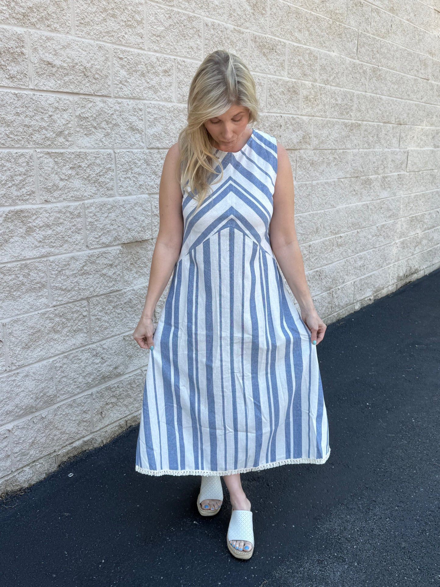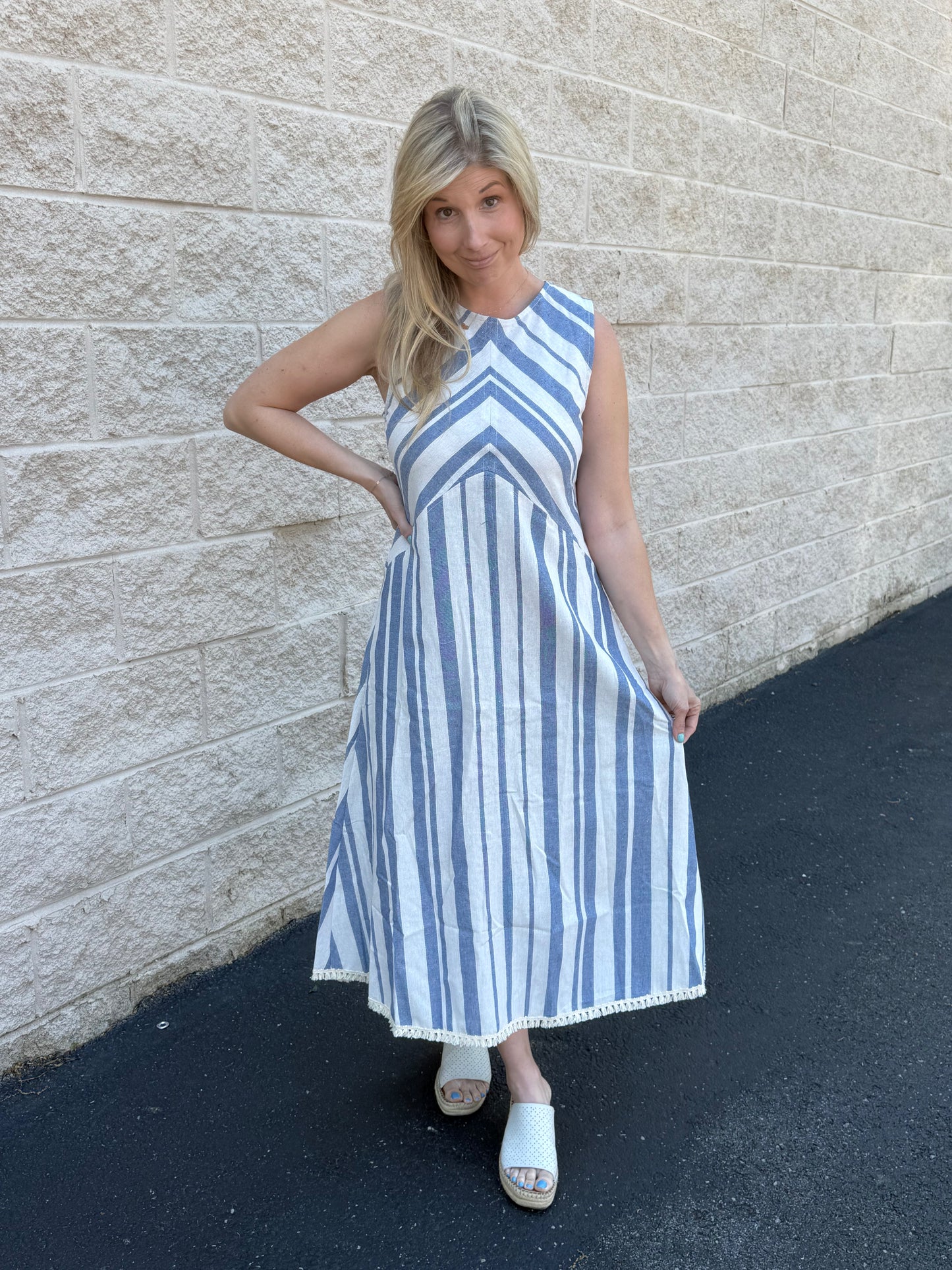Coastal Striped Linen-Blend Sleeveless Midi Dress