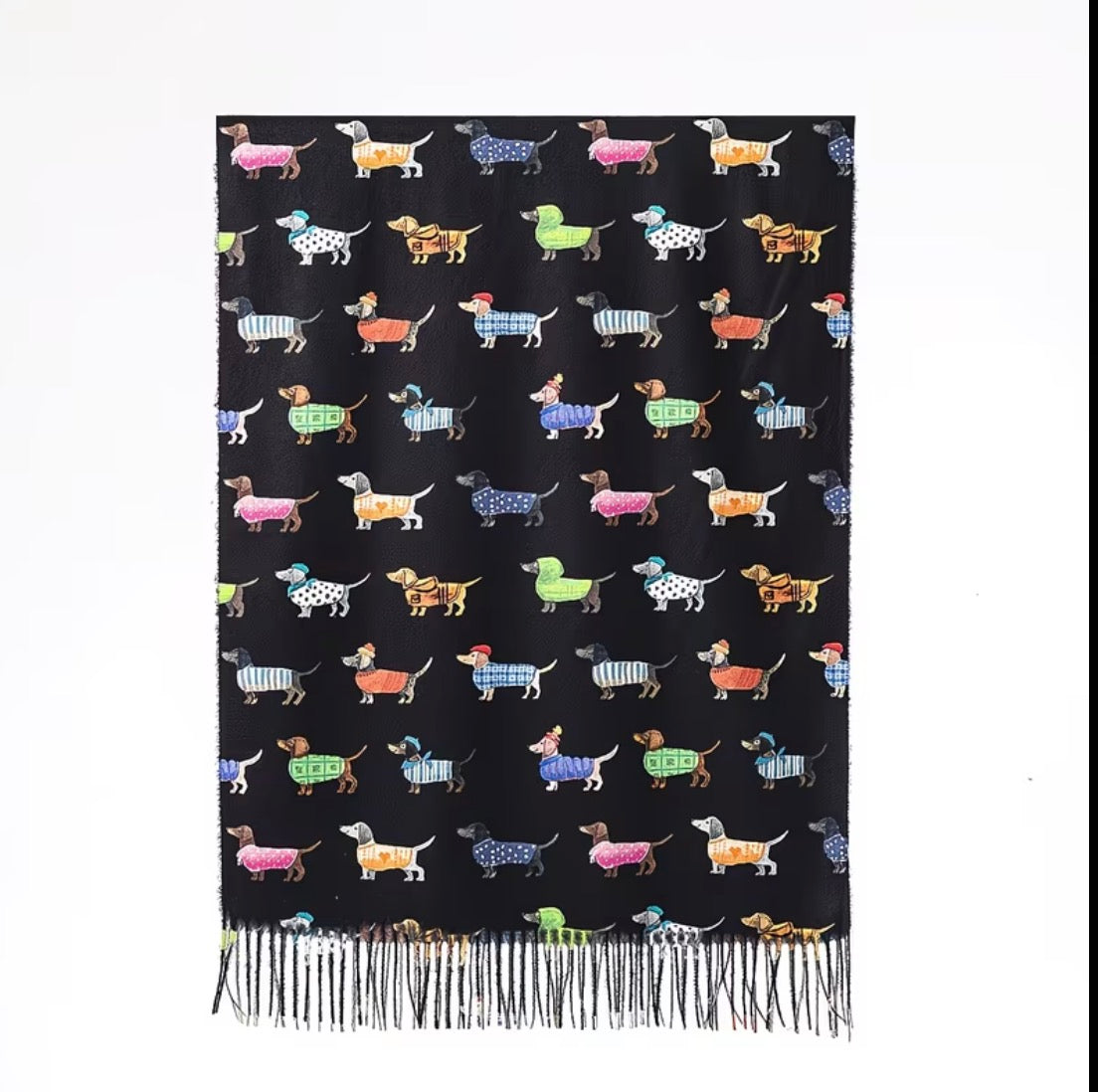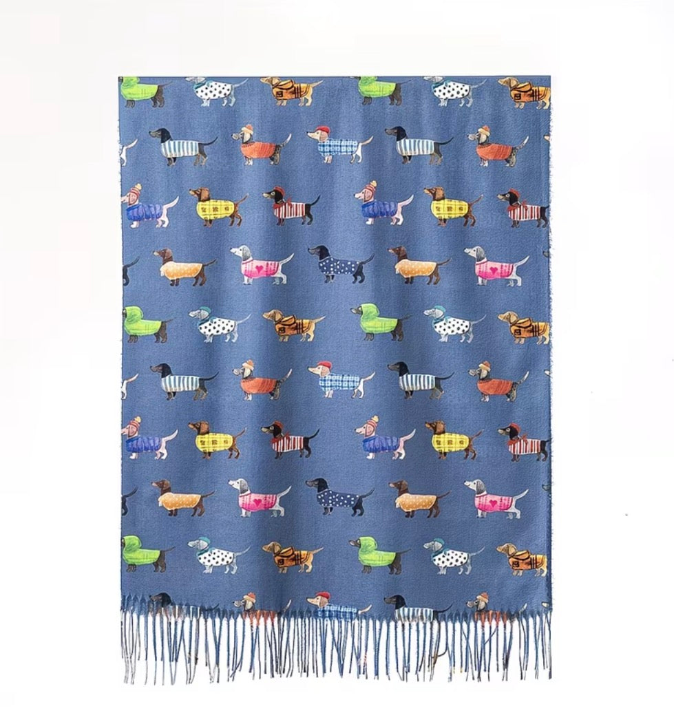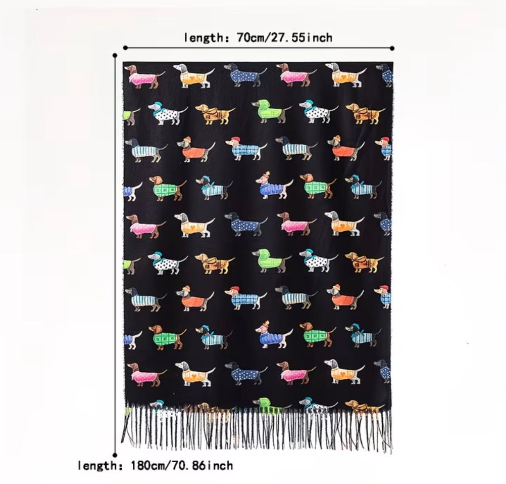 Add a touch of "Doxie" charm to your wardrobe with our Whimsical Dachshund Print Scarf. This soft, lightweight oblong scarf features adorable, colorful pup illustrations that celebrate your favorite long-bodied friends. Designed with elegant fringe edges, it is the ultimate accessory for dog moms and fashion-forward pet lovers. Whether you're layering up for a crisp morning walk or gifting a fellow dachshund enthusiast, this scarf brings effortless personality and "puppy love" to any outfit.