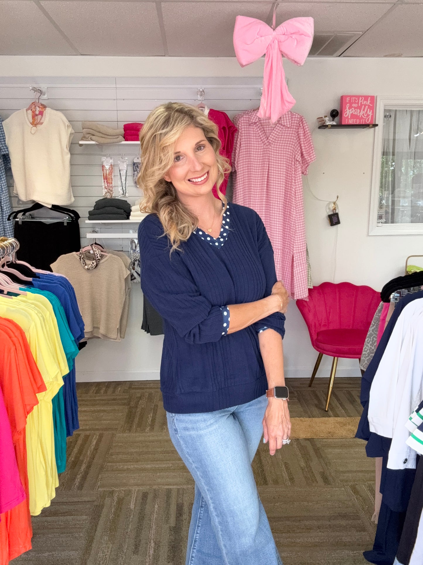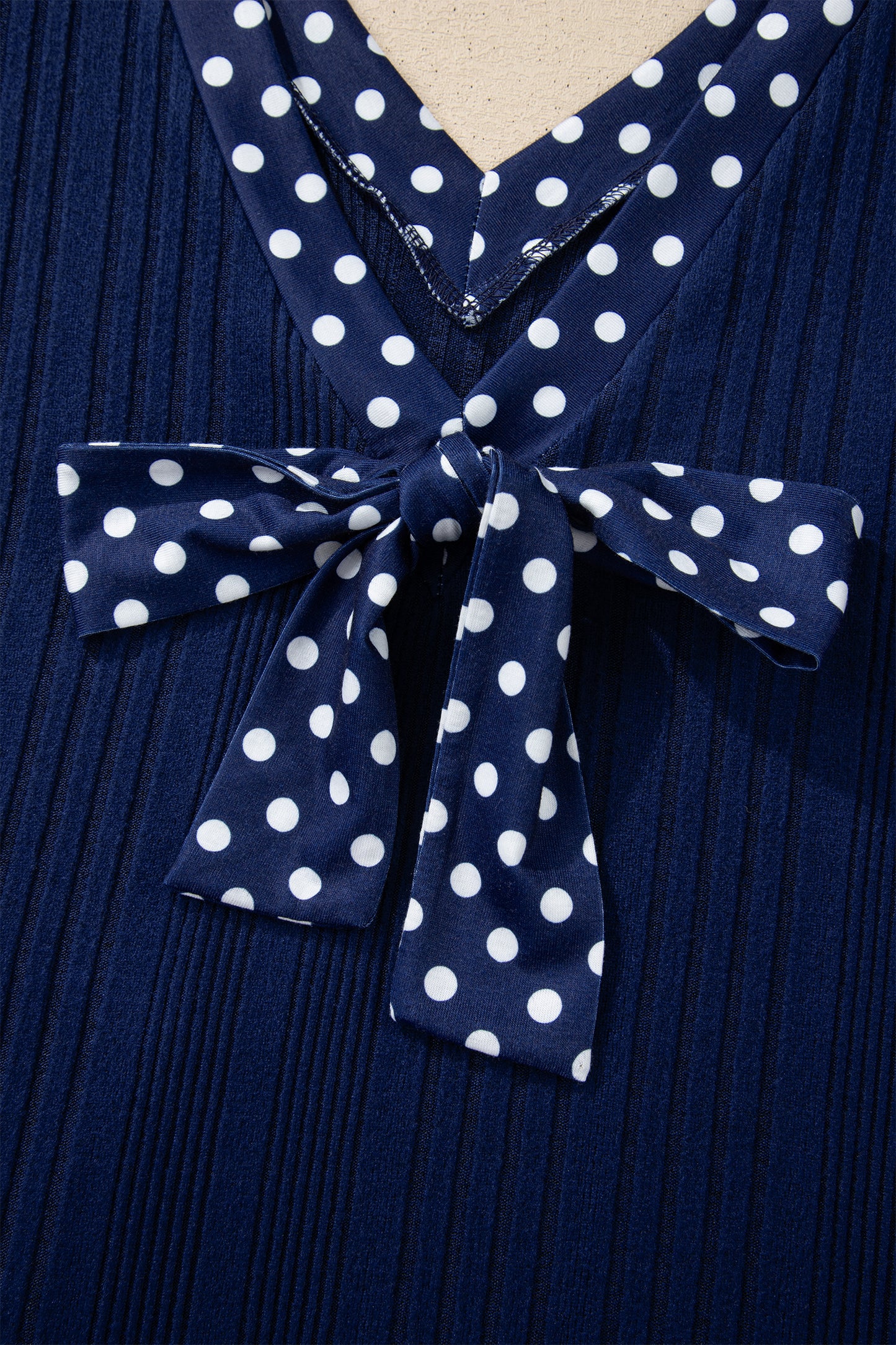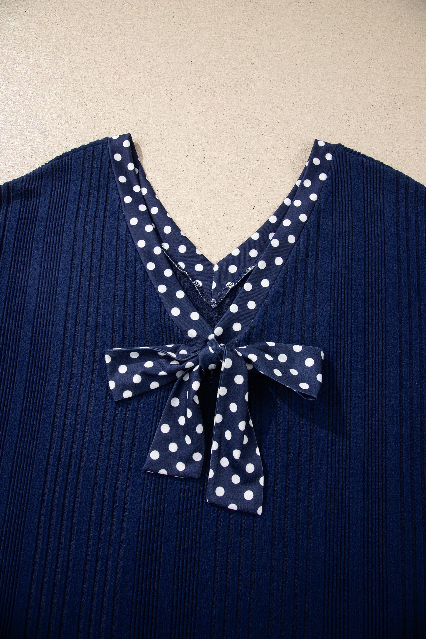 Navy Polka Dot Ribbed V-Neck Top with Back Bow Detail