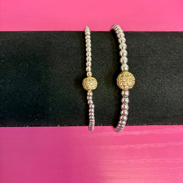 Two is better than one! This stunning set features dainty silver beaded stretch bracelets, each accented with a sparkling gold pave ball for just the right touch of glam. Wear them together for a layered look or separately for subtle sparkle.