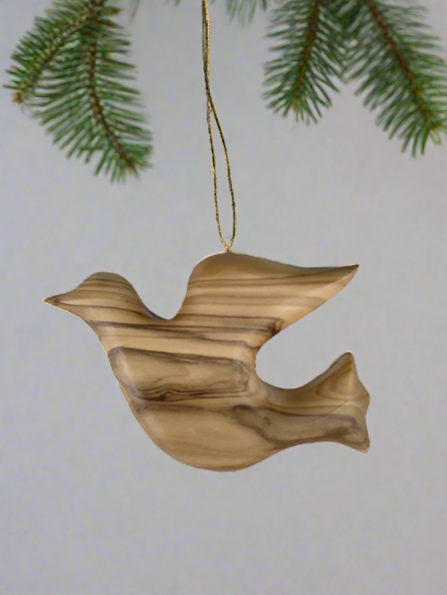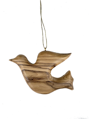 Each dove is carved from sustainably pruned olive wood (no trees are cut down), carrying with it the blessing of the very land where Jesus was born. The wood is carefully dried for over a year to reveal its stunning natural grain patterns. No two ornaments are alike—each one bears unique markings and variations, just as each of us is uniquely created by God.